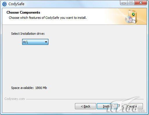 CodySafe对于系统的要求很简单,只要是XP以上的操作系统(支持Vista、Windows 7),以及移动设备有大于5M的剩余空间即可。软件在安装时会自动识别系统中的移动设备,如果电脑当前插有多个移动设备,可以通过下拉列表选择正确的驱动器盘符,如图1。