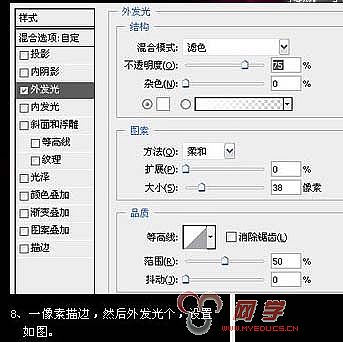 8、回到图层面板,描边一个像素,然后再设置外发光。
