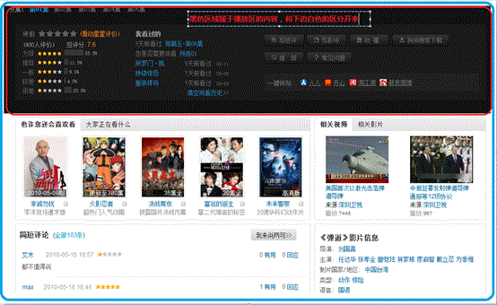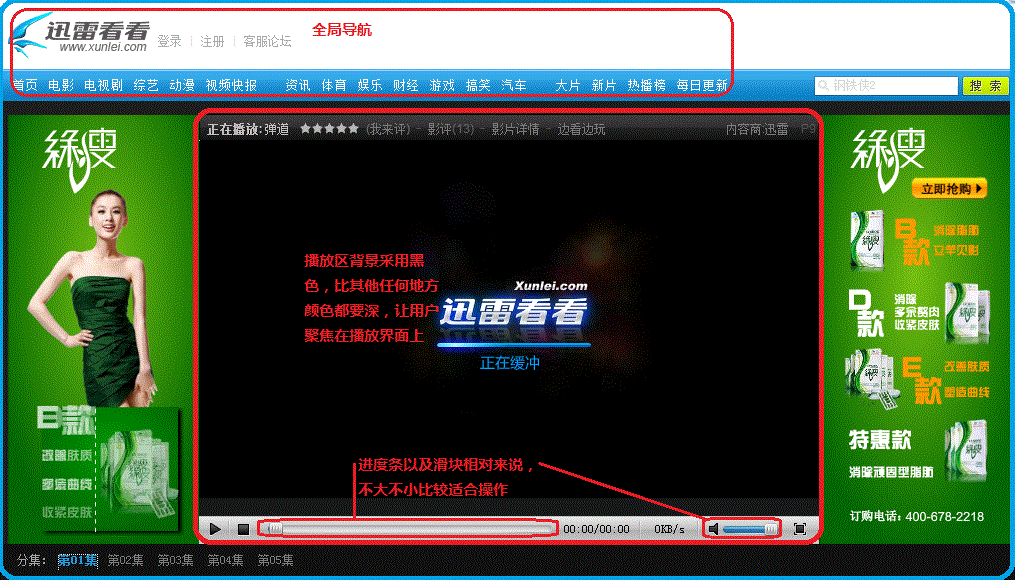 在线播放页面是最终的服务页面,这个页面是整个系统里边至关重要的页面,也是决定用户体验的终极页,系统其它地方设计得再好,也不能弥补这个页面的不好。迅雷看看的在线播放页面的在线播放也和详细信息页一样,很简洁: