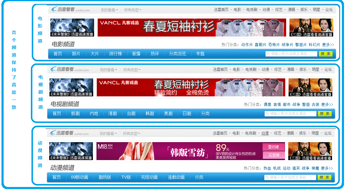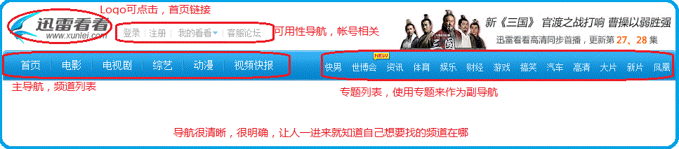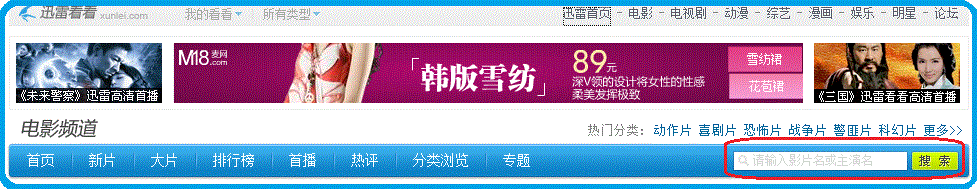 很久之前就想写篇关于迅雷网站的设计分析文章了,迅雷看看一直是我在线看电影的网站,也是我比较喜欢的网站,所以我也比较乐于分析一下它的设计,先从结构上分析,也就是导航、搜索、详细信息展示、以及播放页面的顺序。