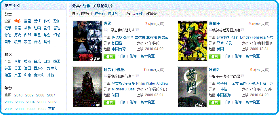 到了这个页面之后,左边仍然显示分类等筛选条件,每切换一个条件,右边的检索结果则会根据选择条件显示相应的结果。整个流程很清晰,不用用户思考,让人感觉到不到导航的存在就直奔自己想看的电影去了。