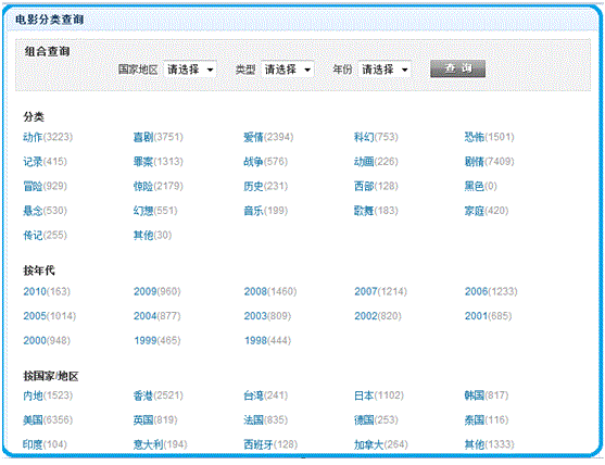 从上边频道截图还可以看到,频道主导航都有一个“分类”的标签,从这个小细节能看得出来,迅雷看看比较重视使用分类来导航的。以电影频道的“分类浏览”来看,点击“分类浏览”,页面如图: